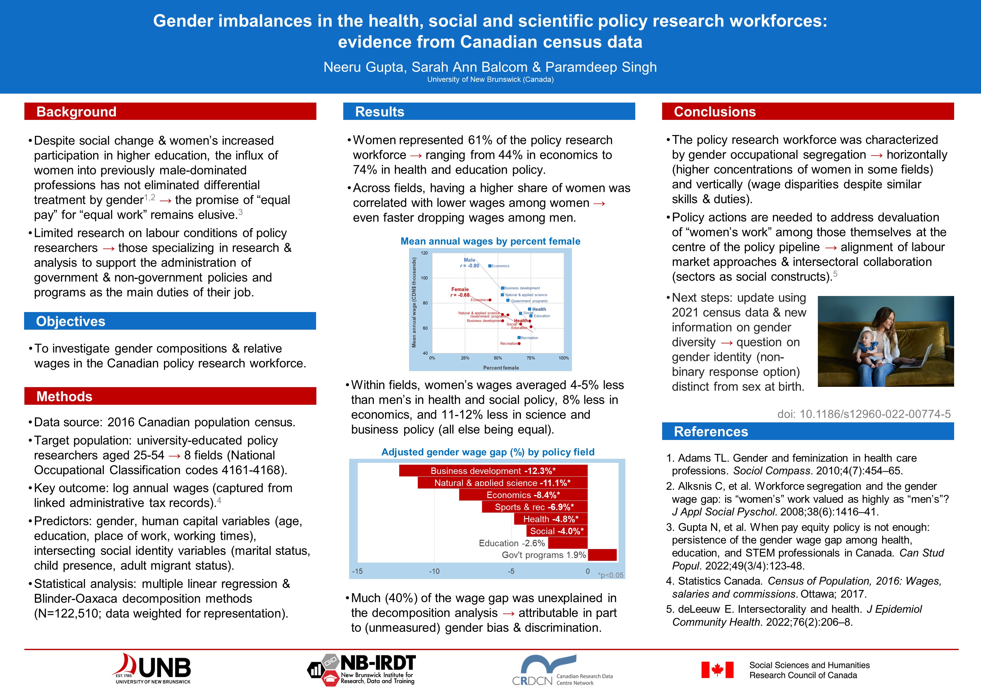 Among the total policy research workforce, 60% were women; the composition ranged from 44% women for economics policy researchers, to 53% women in the natural and applied science policy domain, to 74% in health and in education policy domains. Perhaps not surprisingly, a significant gender wage gap was found, with women earning 8.1% (95% CI: 6.9‒9.2%) less on average annually than men, after adjusting for age, education, and other labour, social, and residential characteristics. Results from a pooled cross-domain log-linear regression presented significantly lower wages among health policy researchers (21% lower; p<0.05) than their counterparts in economics policy research, the only male-dominated occupation under observation. Moreover, Oaxaca-Blinder decomposition analyses showed, of the (observed) female‒male wage differential, 40% remained unexplained by the measured predictors. In other words, women’s earnings averaged around 3.2% less than men’s due to unexplained factors, an outcome that may be attributed, at least in part, to (unobserved) gender discrimination and other sociocultural and economic structures that hinder women’s labour market opportunities.